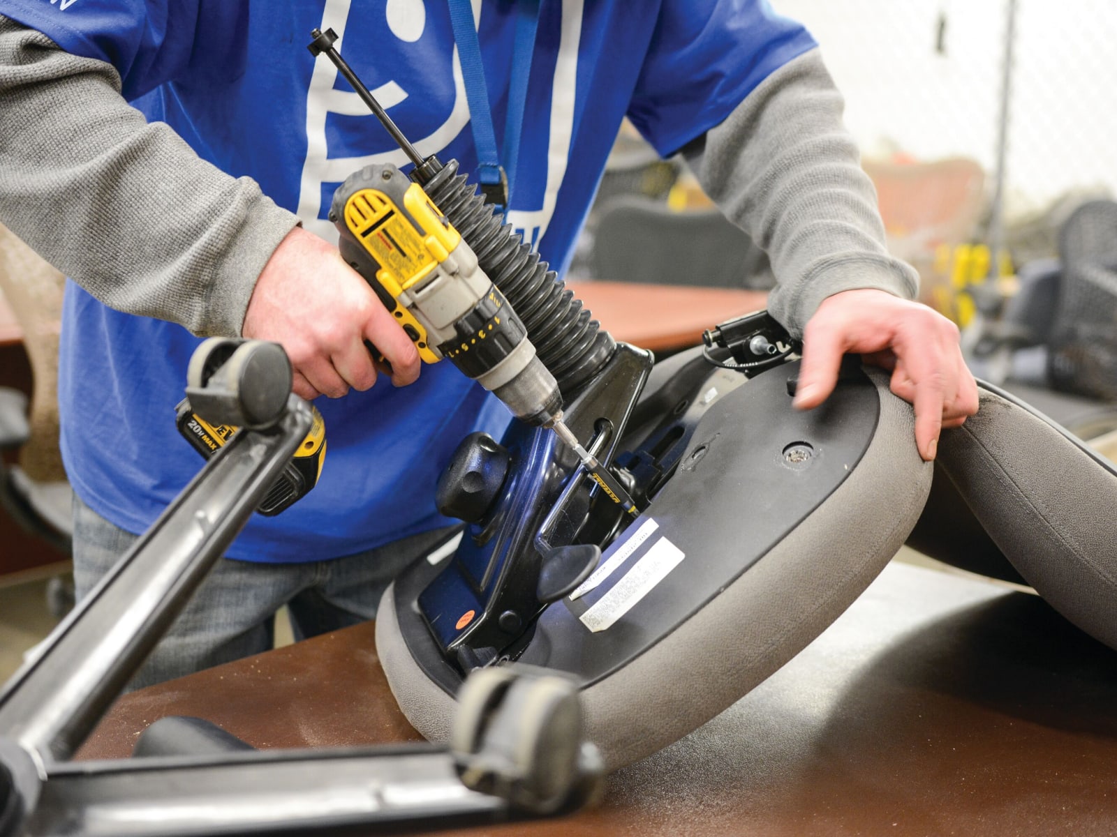 A close up view of a person holding the bottom, underside, section of an office chair and using a drill to secure parts during assembly.