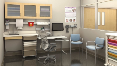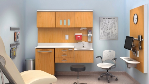 Herman Miller Healthcare Solution: Compass system creates a functional and space-efficient exam room. Components can be reconfigured or rearranged with minimal downtime and no renovation disruption.