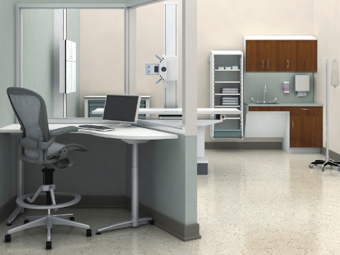 Herman Miller Healthcare Solution: Height-adjustable table and Aeron stool, cart and locker, Casework, and technology support create a radiology room. Co/Struc storage provides a good deal of storage capacity without a large footprint.