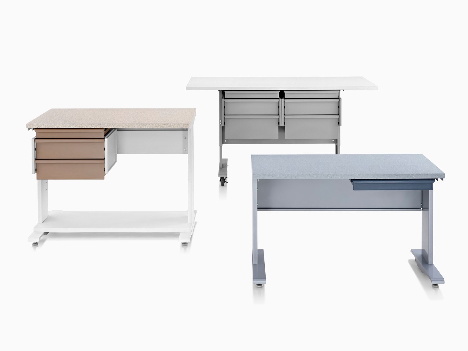 検査室。強度と耐久性が高いコンポーネントは、人間工学的なワークスペースを作り出し、テクノロジーの変化に対応して、必要に応じてアレンジ可能です。ワークサーフェスをケースワークでサポートする必要がないため、カウンターの下のストレージやワークサーフェスを、実際のニーズに対応するようにすぐに変えることができます。