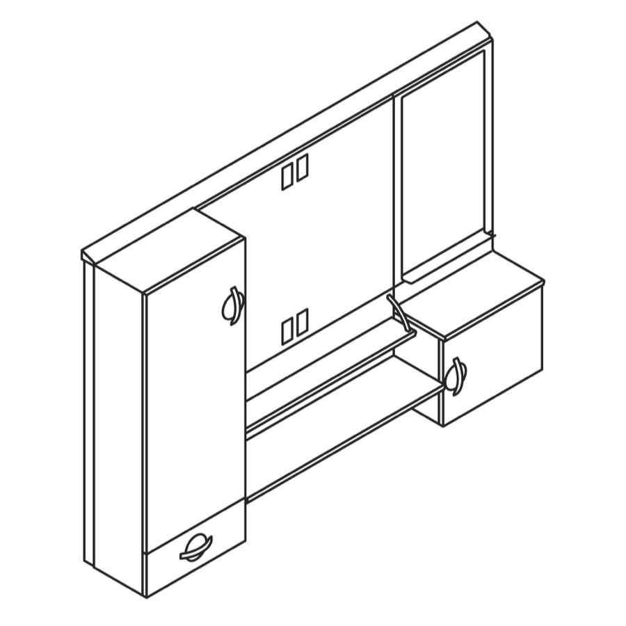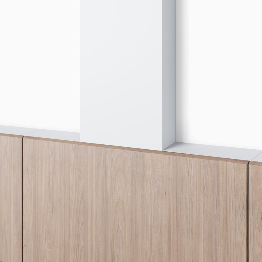 Detail of Compass casework wall unit in an elm wood finish with a utility case in a white finish that runs vertically to the ceiling.