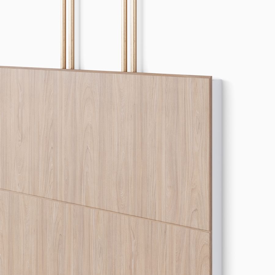 Close-up of Compass casework tiles in an elm wood finish with copper utility pipes extending from the top.