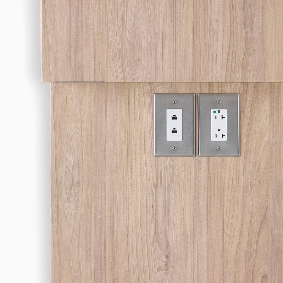 Close-up of power and data outlet access on Compass System in a medium wood finish.