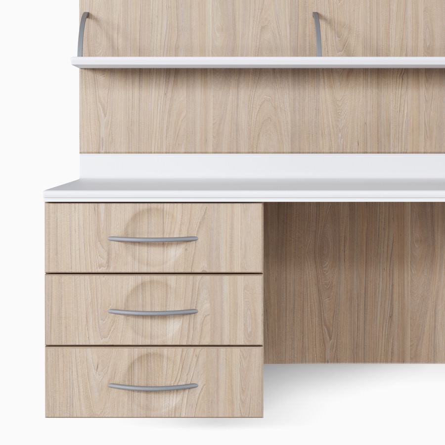 Compass casework storage drawer in an elm wood finish and a flex pull in a gray finish.