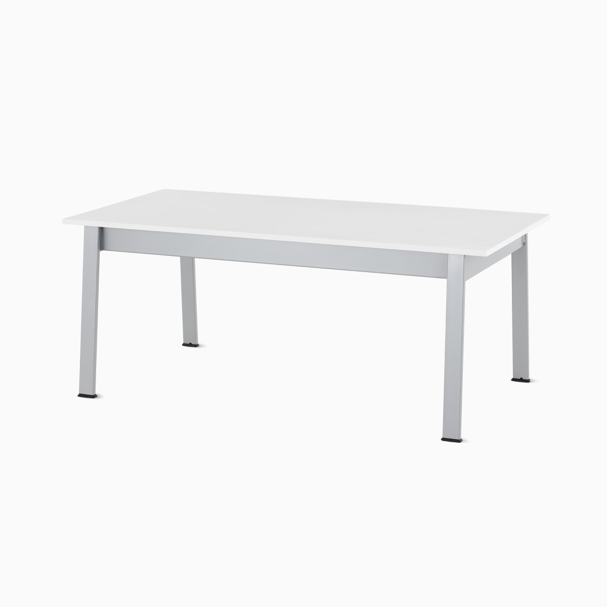 Angled view of an Easton Coffee Table with a glacier white Corian top and metallic silver legs.