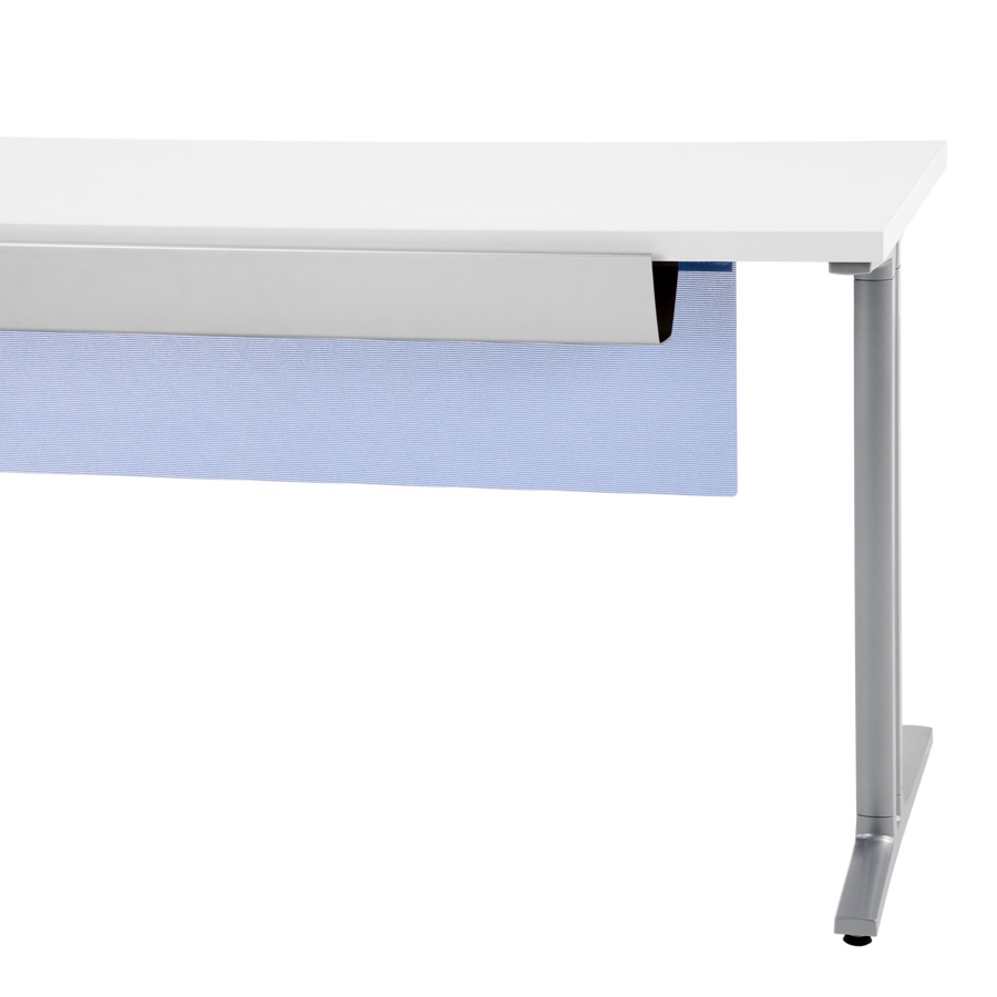 Close-up of a mesh-fabric modesty panel, attached to a light ash work surface.