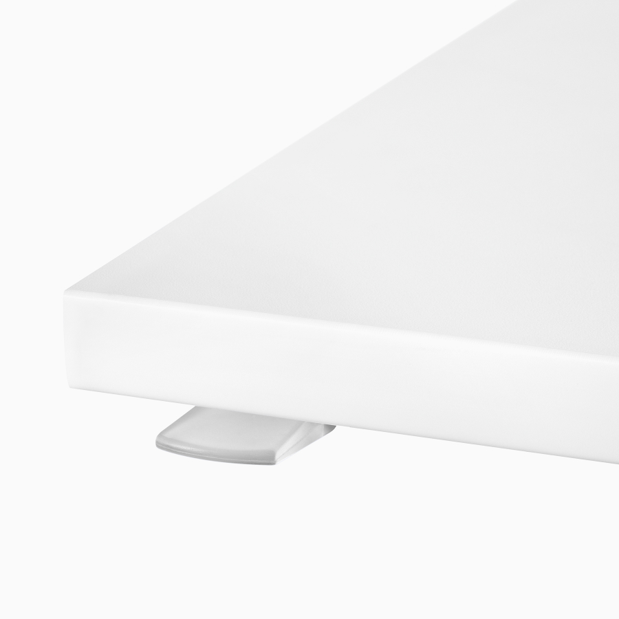 A close-up view of a Renew Link standing desk system's white work surface's eased edge.
