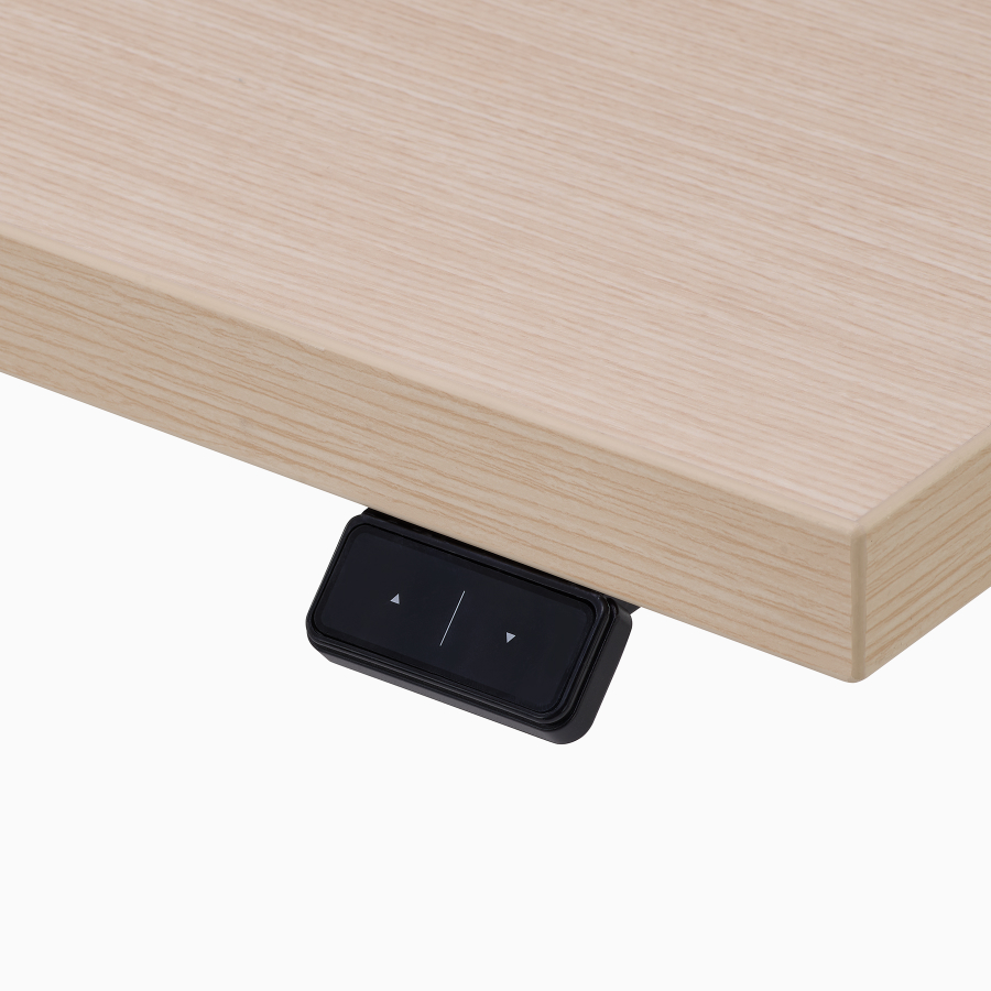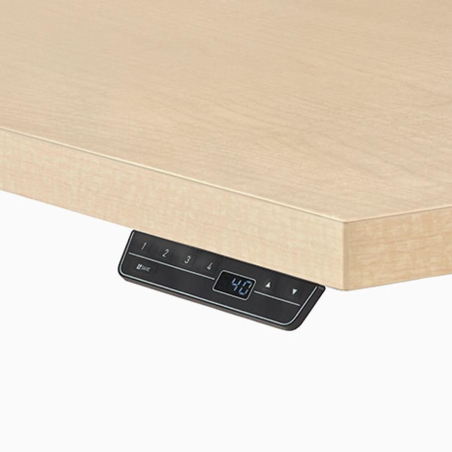 A close-up view of a Renew Link standing desk system's light wood work surface's thin edge.