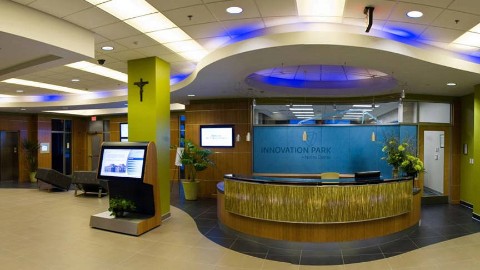 Across the street from the Notre Dame campus and within sight of its golden dome, a three-story brick building represents a promise and a culmination. A promise because this building is the first of a planned 12-acre complex, and a culmination because it captures part of the university's core vision to develop the potential of its research ideas and bring them to the marketplace. At Innovation Park at Notre Dame, "we try to help early-stage companies accelerate and grow," says Natalie Stahl, facility manager.