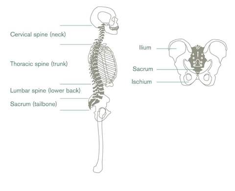 The cervical region is in the neck area of the spine, from the skull to the shoulders. It is highly flexible and strong. The neck balances and supports the head, which weighs about eight pounds (3.63 kilograms). The thoracic region is the upper and middle parts of the spine. Because it is connected to the rib cage, the thoracic region has very little mobility. The lumbar is the region of the lower back that contains only five lumbar vertebrae, though they are the largest vertebrae in the spinal column. The lumbar region is capable of a great deal of movement. Below the lumbar area lies the sacrum, made up of five fused vertebrae held between the pelvic bones on each side.
