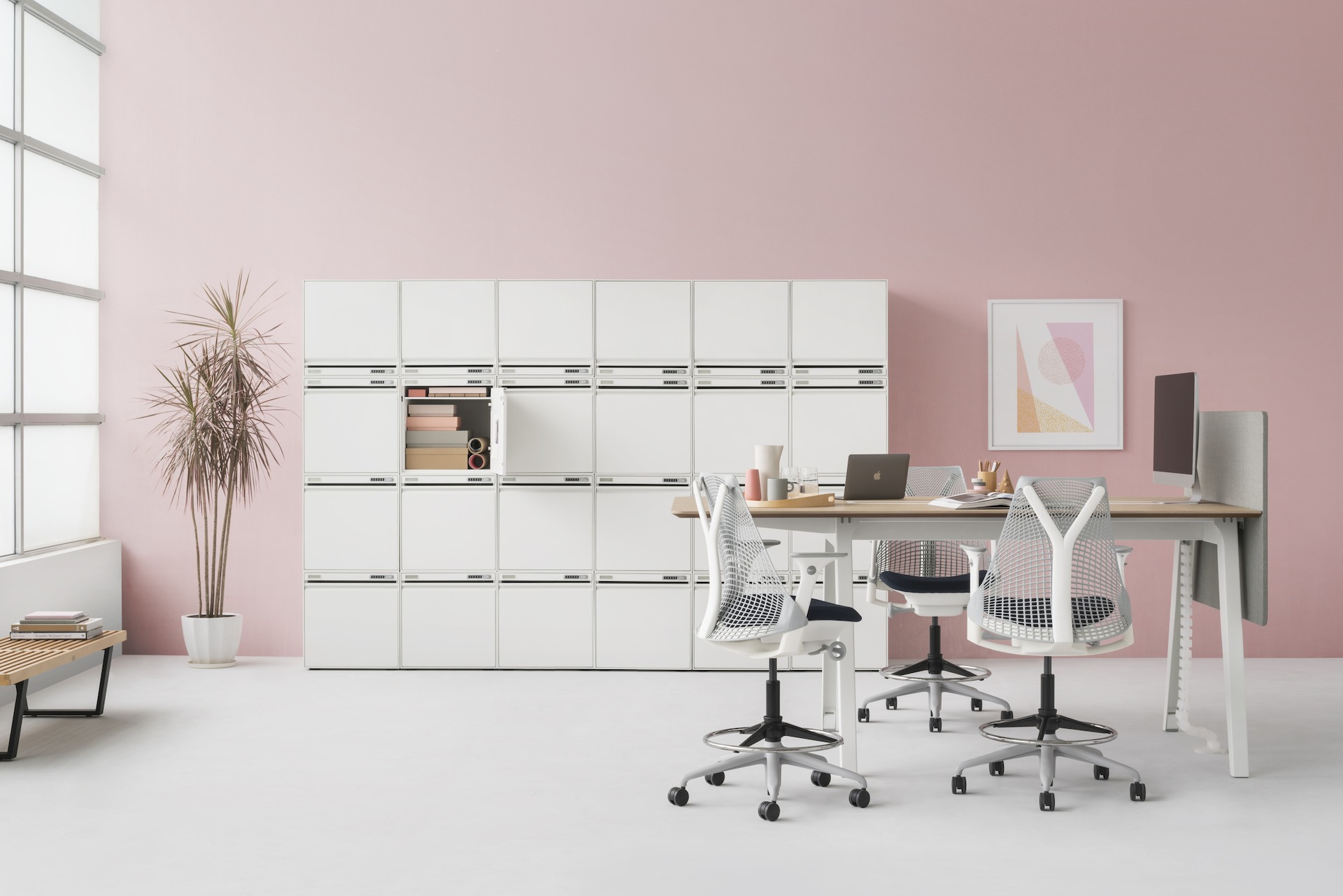 A six-piece CKL Keyless Storage Unit sits against a pink wall. It features 24 small storage lockers. In the foreground, a high Optimis Table and four Setu stools combine to form a meeting area.