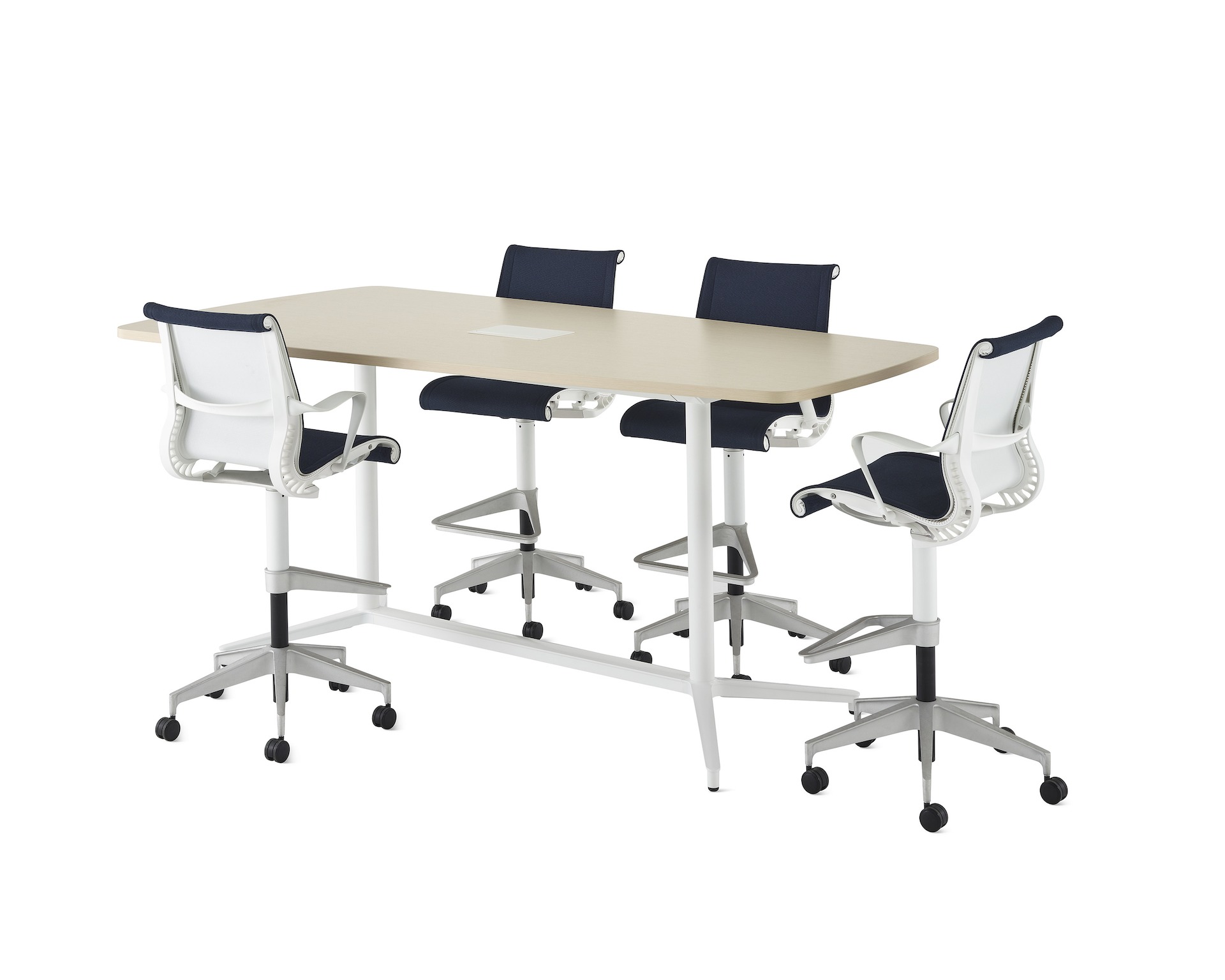 A tapered shape, standing Y base Headway conference table with an ash laminate top and white base  surrounded by Setu stools viewed at a 45-degree angle.