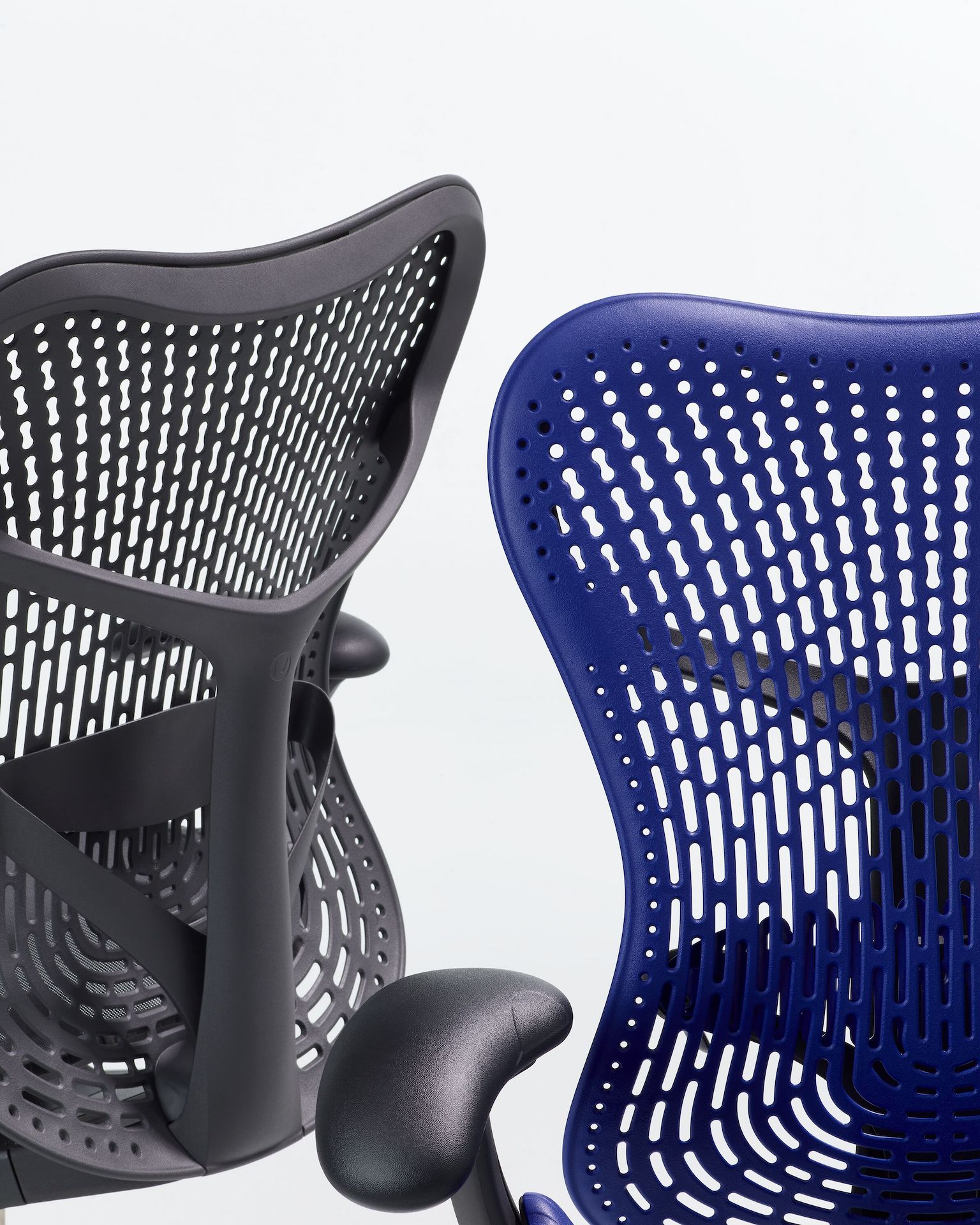 Close up of 2 Mirra 2 chairs with a Triflex back.  One in graphite and the other in ultramarine.