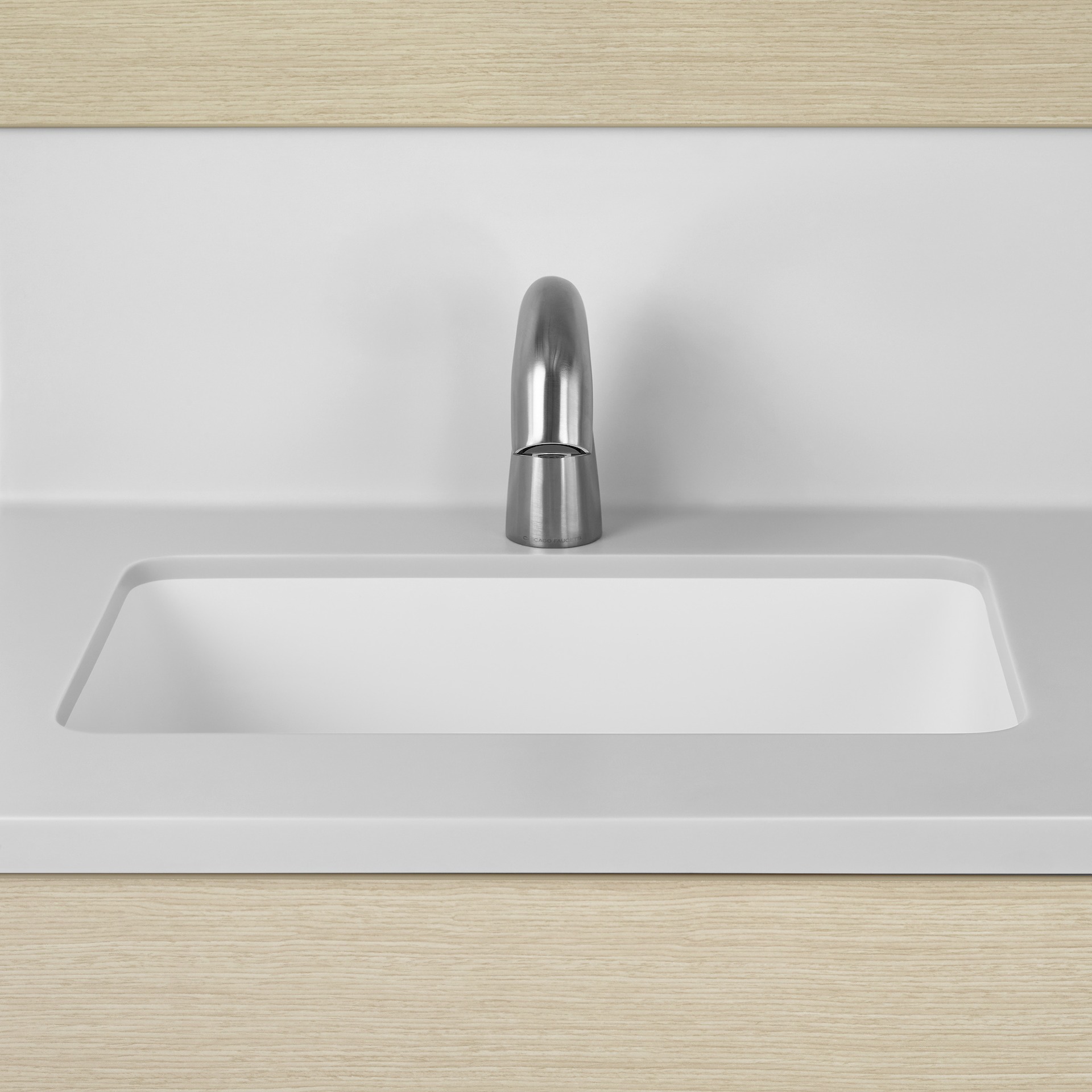 A close-up view of a Mora Systems casework integrated sink and backsplash in white solid surface.