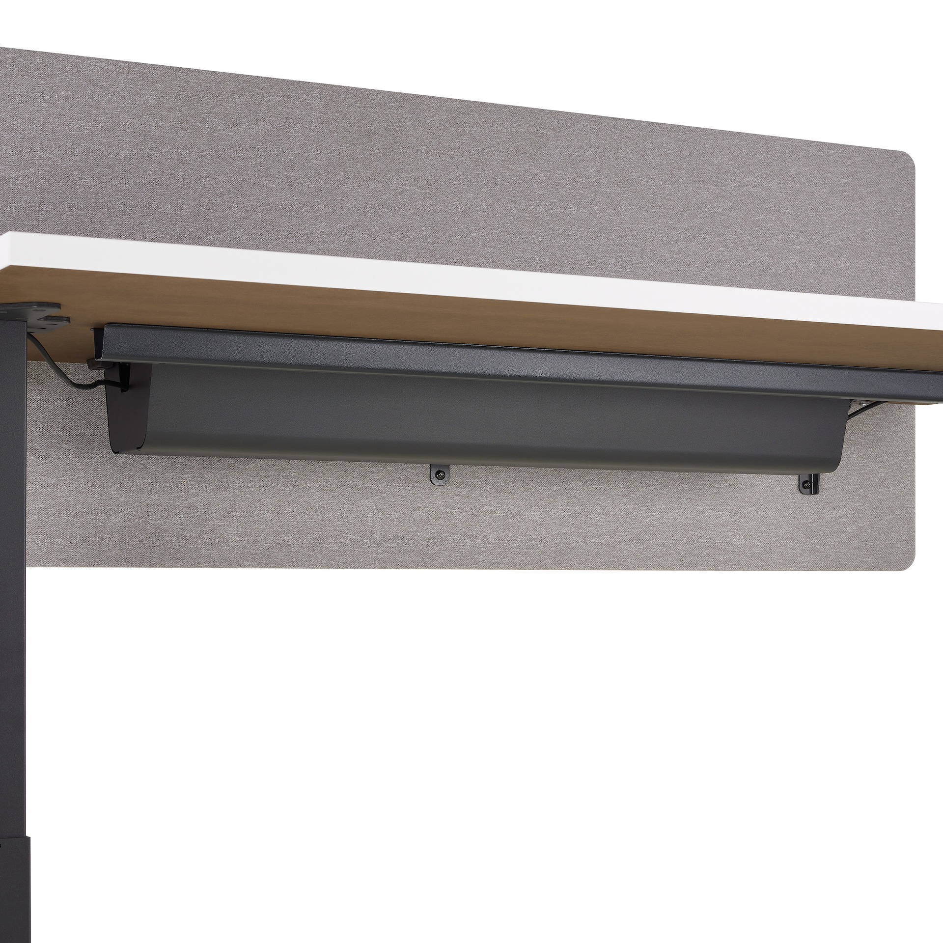 Close-up of a hinged cable tray found attached under a Motia Sit-To-Stand Table.