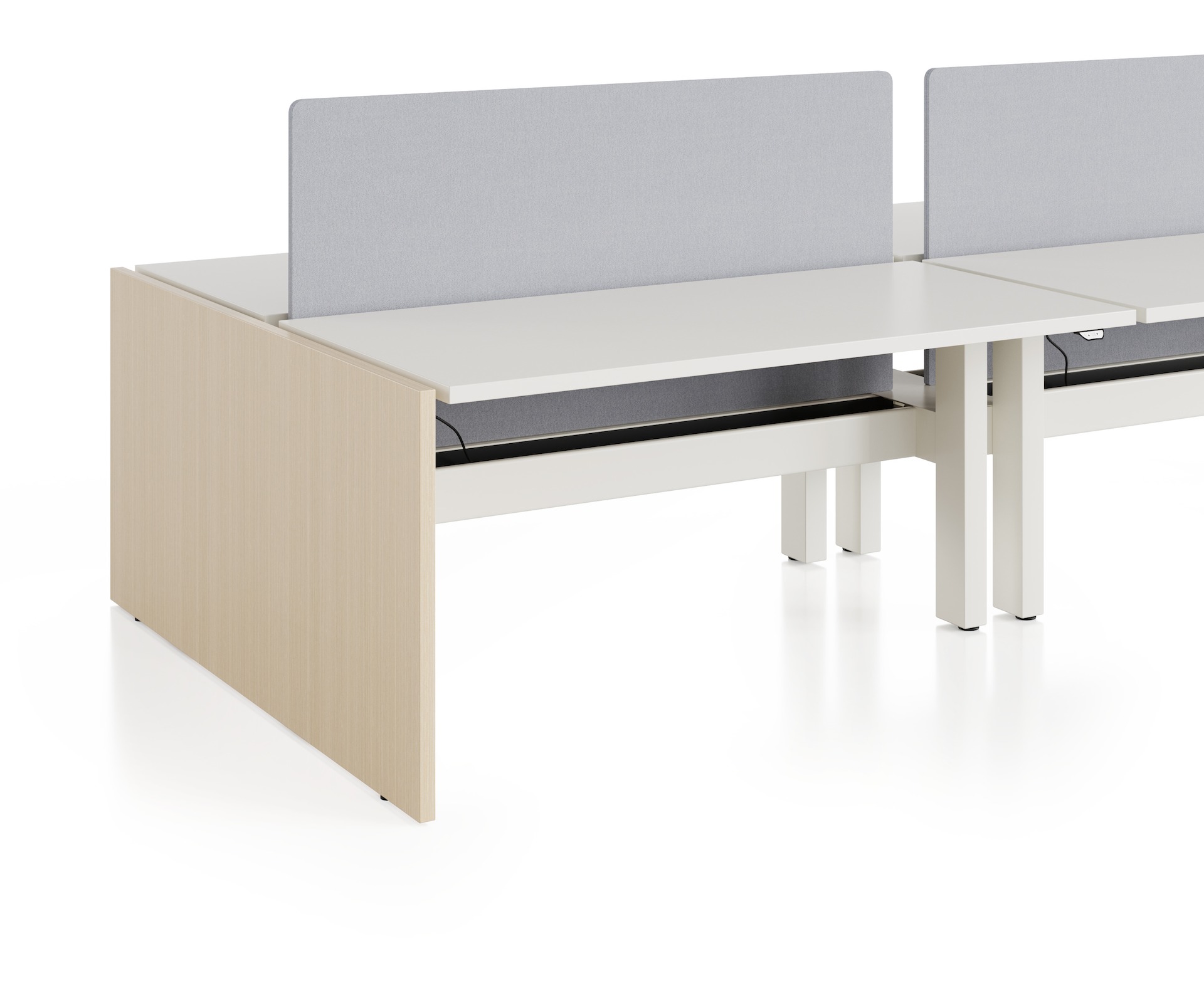 Close-up of standing desk system, Nevi Link, with a light ash gallery panel placed at the end of the workstation.