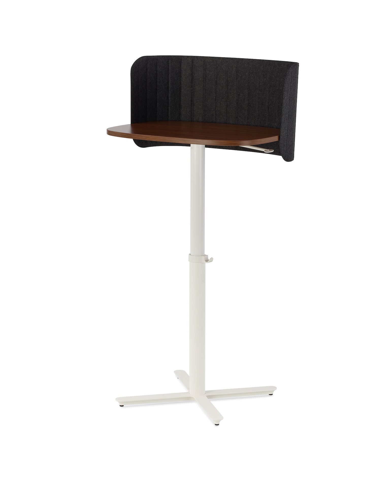 Large Passport Work Table with walnut surface, white base on glides and a dark grey screen.