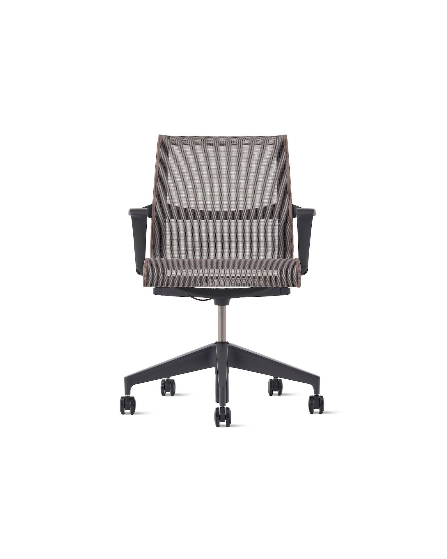 Front view of a Setu chair with fixed arms with a dark grey frame and base with light brown suspension.