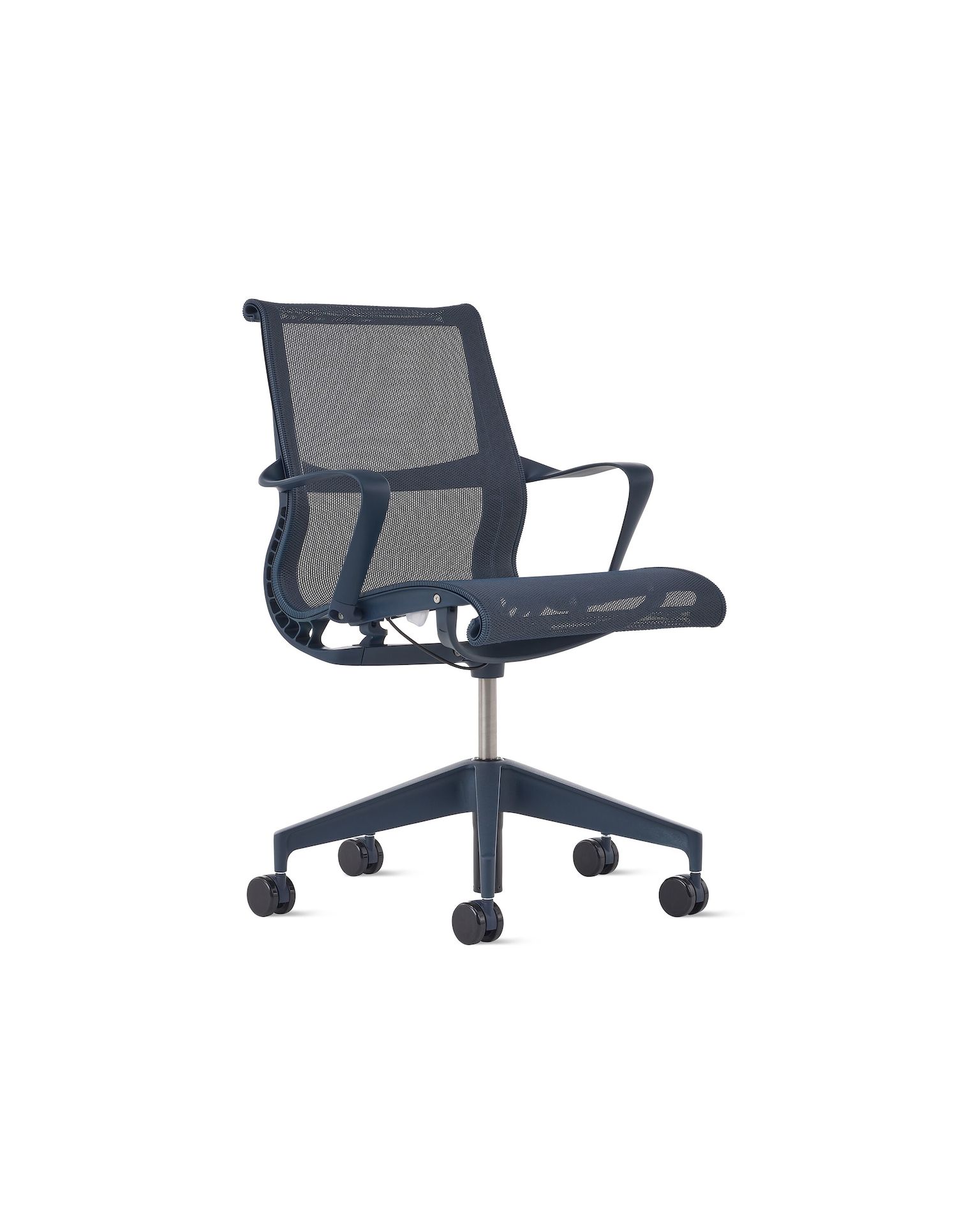 Front angle view of a Setu chair with fixed arms in dark blue.