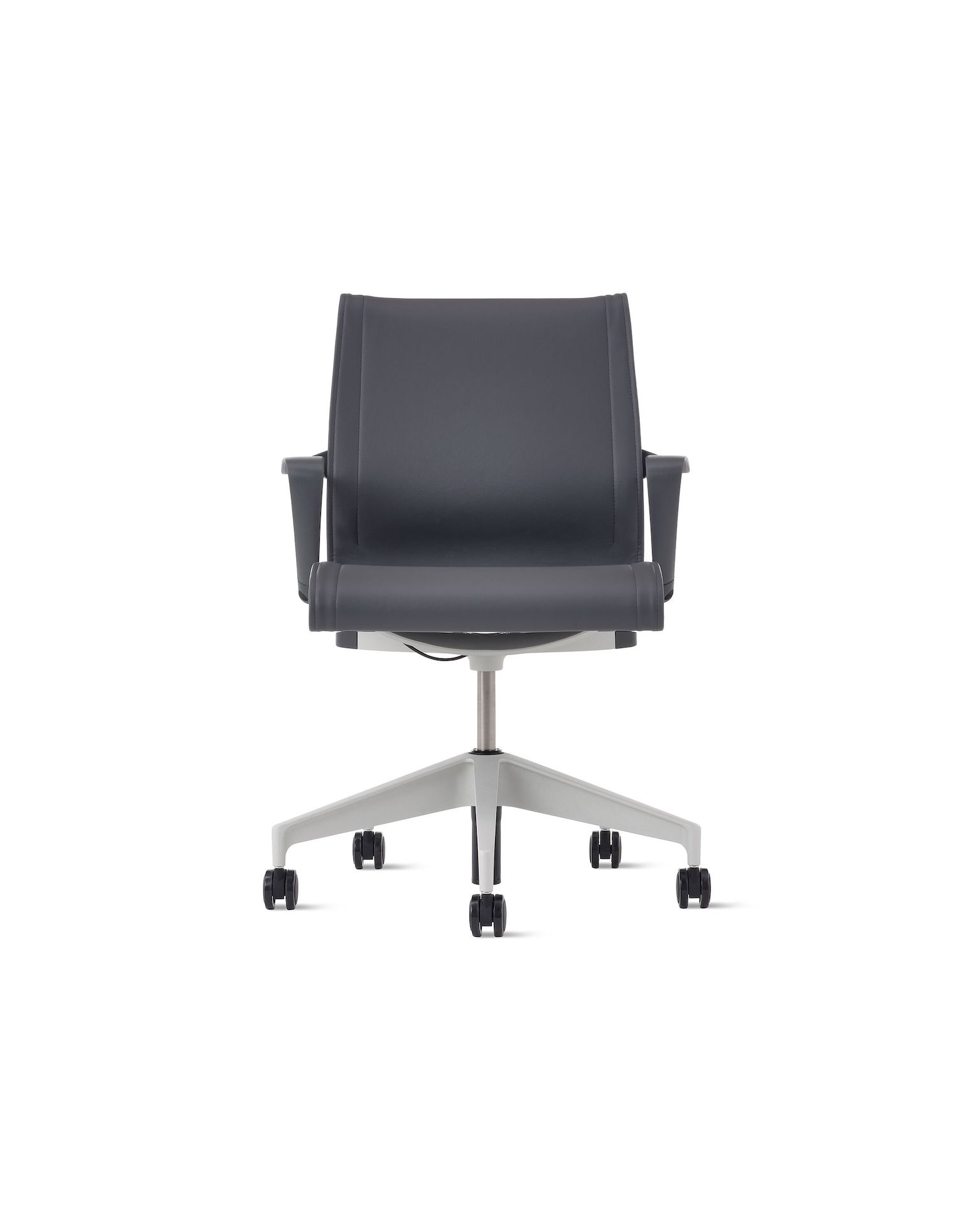 Front \view of a Setu chair with carbon upholstery and frame with a silver alloy base.