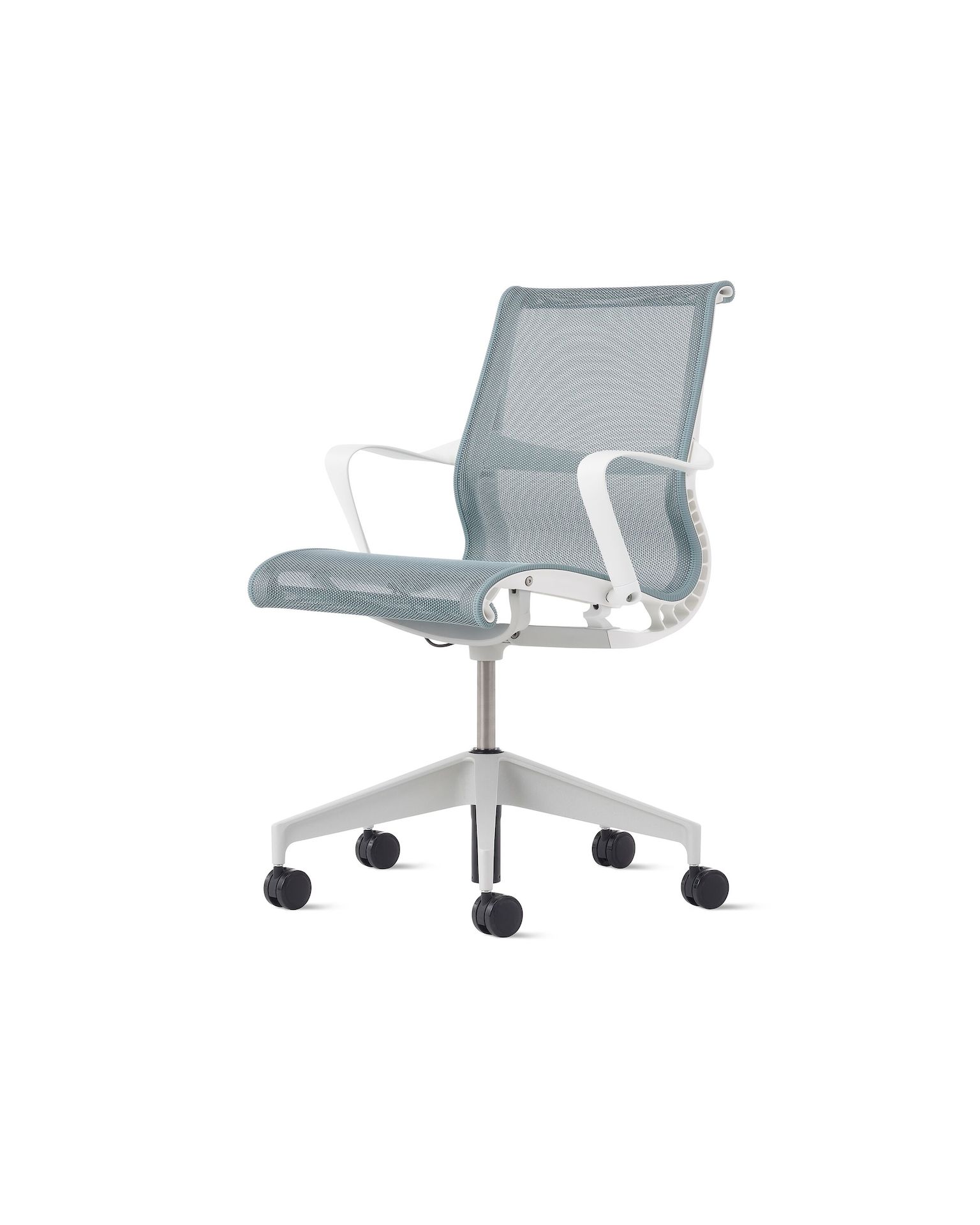 Front angle view of a Setu chair with fixed arms and frame in white, base in silver and suspension in light blue