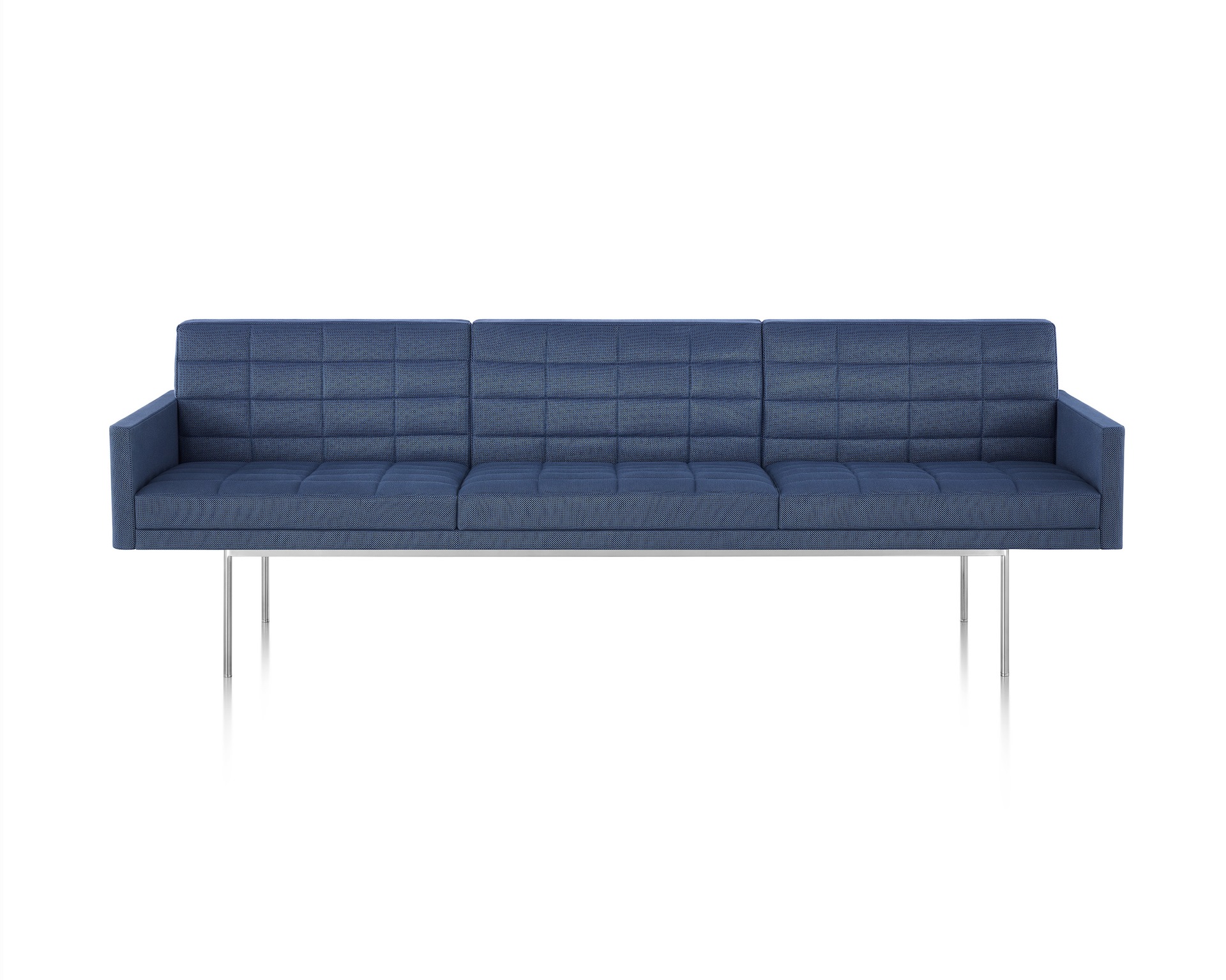 A three-seat Tuxedo Component Sofa with a metal base and quilted upholstery.