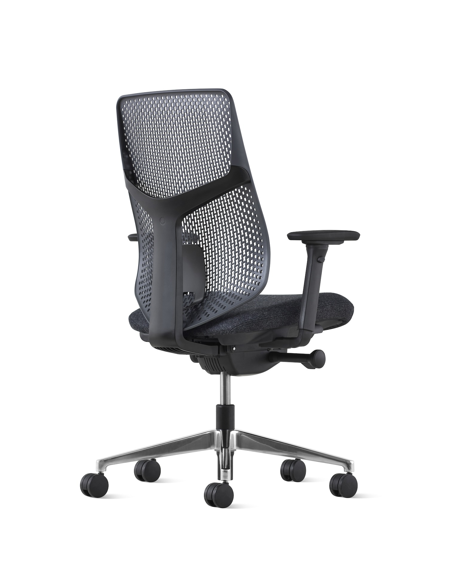 A black Verus Chair with Triflex back, viewed from the back at an angle.
