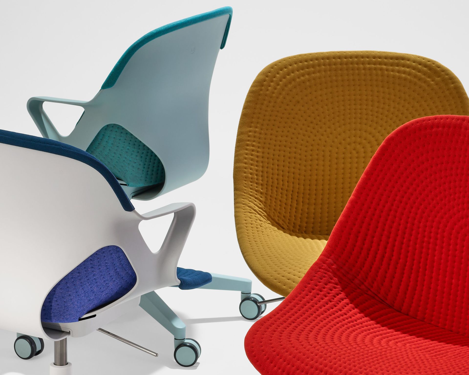 Close up of four Zeph chairs including: a fixed arm chair in glacier with a glacier unibody seat pad, a fixed arm chair in alpine with a nightfall unibody seat pad and two armless chairs, one with a mustard yellow unibody seat pad and another with a blaze unibody seat pad.