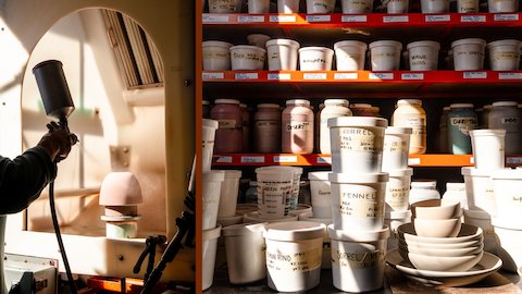 Formed, dried, and trimmed, the piece is off to be glazed: highly textured matte to smoother matte, and from satin to gloss. These glaze recipes are developed and mixed in-house to allow the glaze to chemically react to the clay’s natural materials during the firing process. Glazers, who undergo months of training due to the amount of experience needed to ensure uniform glaze application, set up in special booths armed with spray guns to coat each piece.