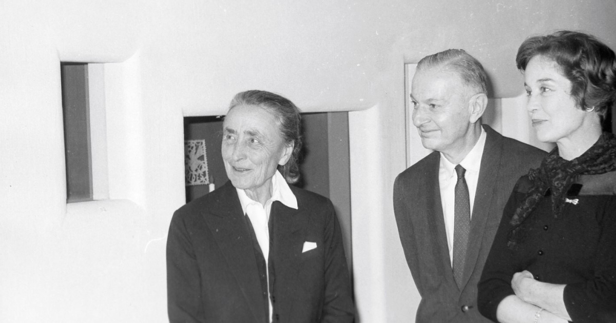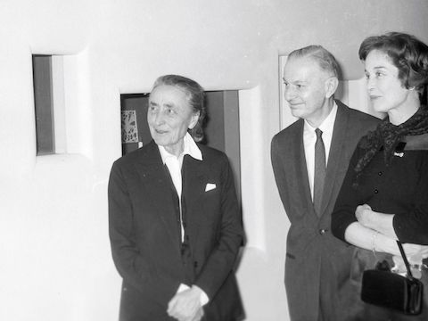 Photographer unrecorded. Georgia O’Keeffe with Alexander Girard and Susan Girard at Nacimiento exhibition, 1961. Alexander Girard Collection. AR.00019, Box 30, Folder 4. Bartlett Library and Archives, Museum of International Folk Art, Santa Fe, NM.